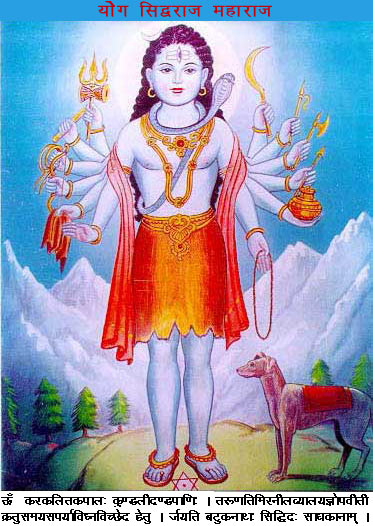 The Guru is the guiding force inside our body. He awakens the force first and then helps the student to achieve his goal by practicing many exercises. In chapter No.52 of AGNI PURAN detailed description about this force(Gurudev) is given. It is known as BHAIRAVA. It is a force having twelve hands with different ayuds. His age is about 8-12 years. Picture of this force is shown here.